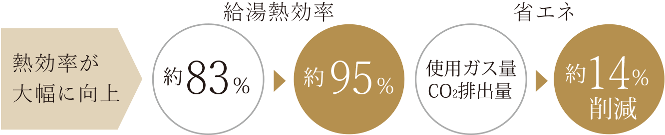 従来、放熱や排気ガスとして捨てていた排熱を再利用し、水を温めることで環境負荷とランニングコスト、双方の低減が可能。熱効率を大幅に向上させた熱源機です。